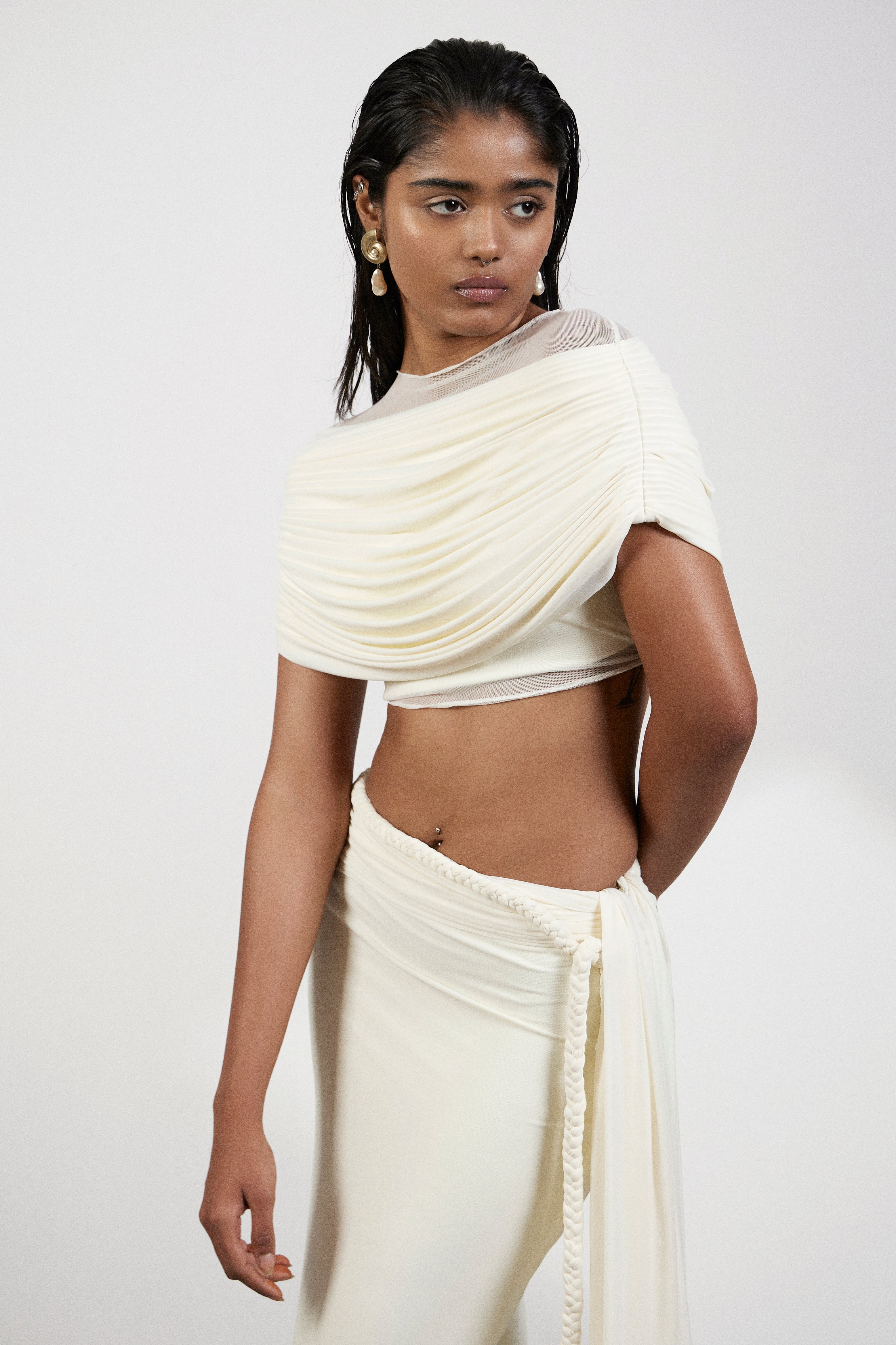 This elegant off white skirt and top set is a perfect blend of delicate details and modern design. The top is crafted from airy mesh with an off-shoulder silhouette, adding a soft yet bold touch. Featuring pleating at the waist for a flattering fit, it also boasts twisted rope detailing with tassels that cascade elegantly, creating movement. The dress net adds a final layer of sophistication, enhancing the flowing look of the ensemble. This set is the perfect choice for a refined yet contemporary statement.