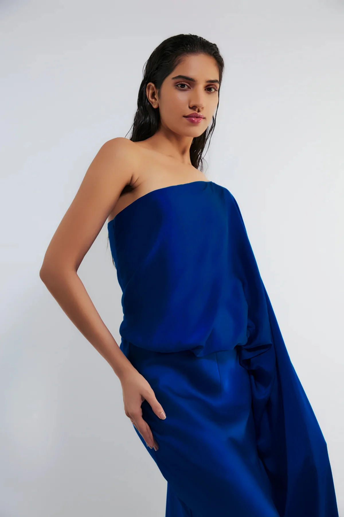 An electric blue, loose, flowy, one-shoulder gown creates a captivating and vibrant look. The vivid hue of electric blue adds a striking and bold element, while the loose and flowy design contributes to an effortlessly elegant silhouette. The one-shoulder style adds a touch of asymmetry and modernity, making the gown an eye-catching choice for special occasions or events.