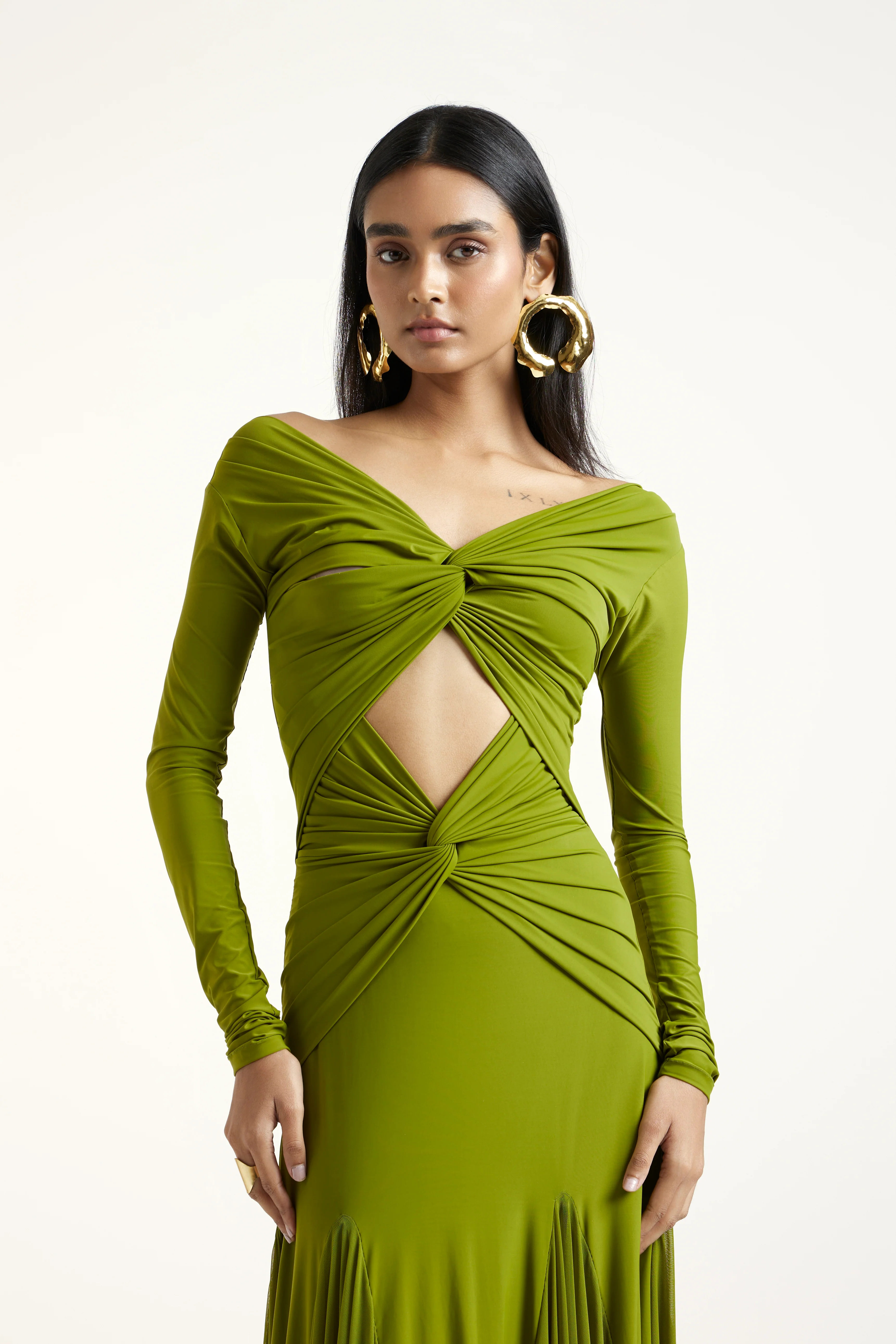 The Clea dress, a floor-length gown featuring long fitted sleeves, a twisted draped neckline, and a central front cut-out at the torso. The bodice is ruched and sculpted, flowing into a soft, full, draped skirt. The back is sleek and fitted at the top.