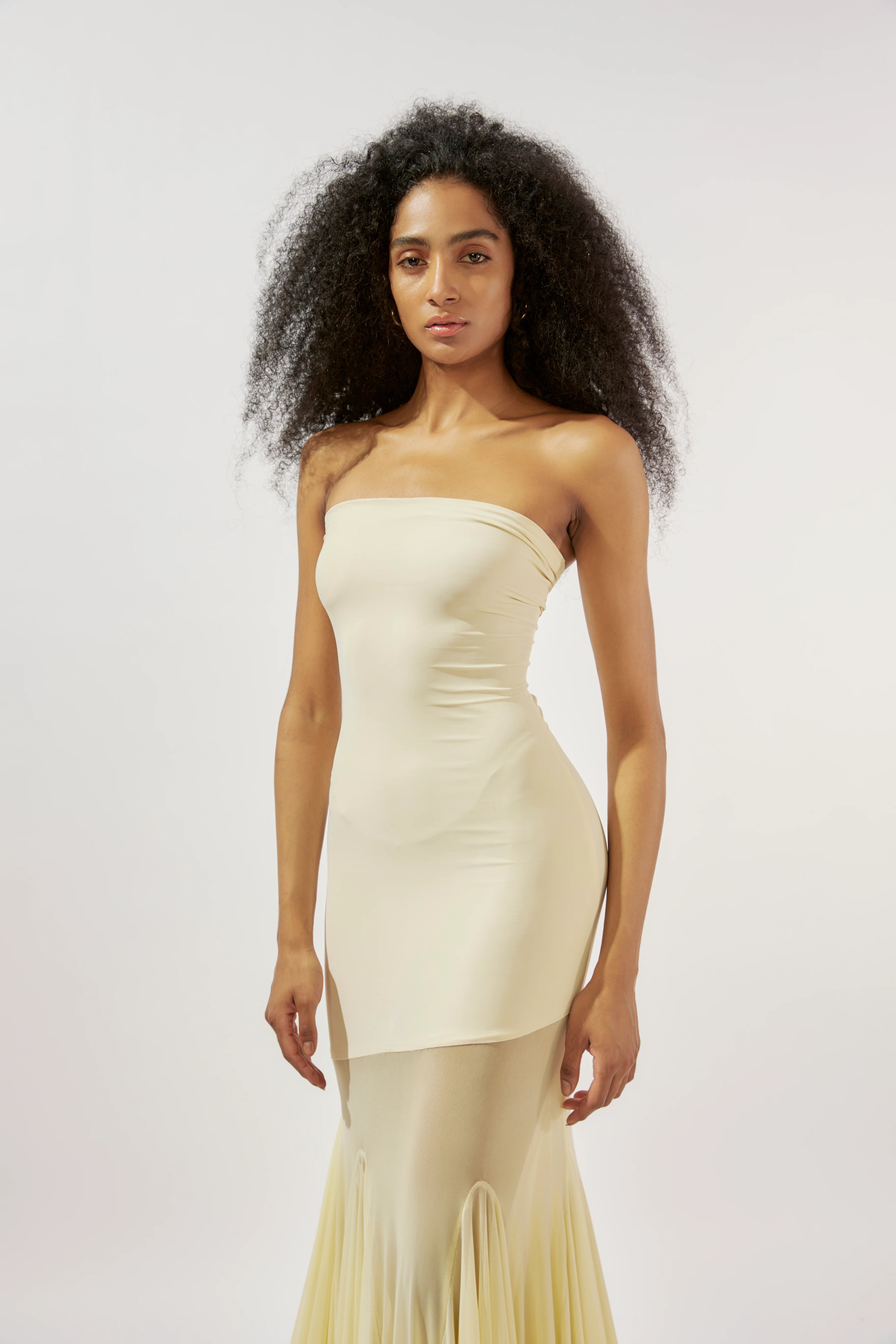 Indulge in the allure of sophistication with this butter yellow malai lycra tube gown, adorned with flared mesh panels for a touch of whimsical charm. The strapless bodice contours your figure with a flattering silhouette, while the buttery hue infuses warmth and vibrancy into your ensemble. Flowing from the waist down, the flared mesh panels add movement and dimension, creating an enchanting aura as you glide across the room. This gown exudes timeless elegance and feminine grace, ensuring you stand out with effortless poise and style.