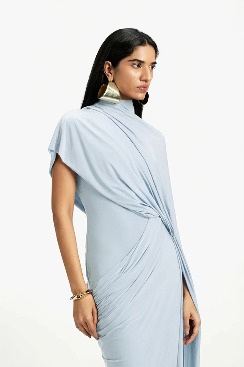 The malai lycra gown features a fitted body that highlights the natural silhouette, with a cowl detail at the low waist adding texture and interest. An asymmetrical cape-like drape extends from the design, creating a sense of flow and movement. The soft and stretchy fabric ensures a comfortable fit while maintaining a sleek appearance. The combination of the fitted body, low-waist cowl, and flowing cape detail offers a balanced and unique design.