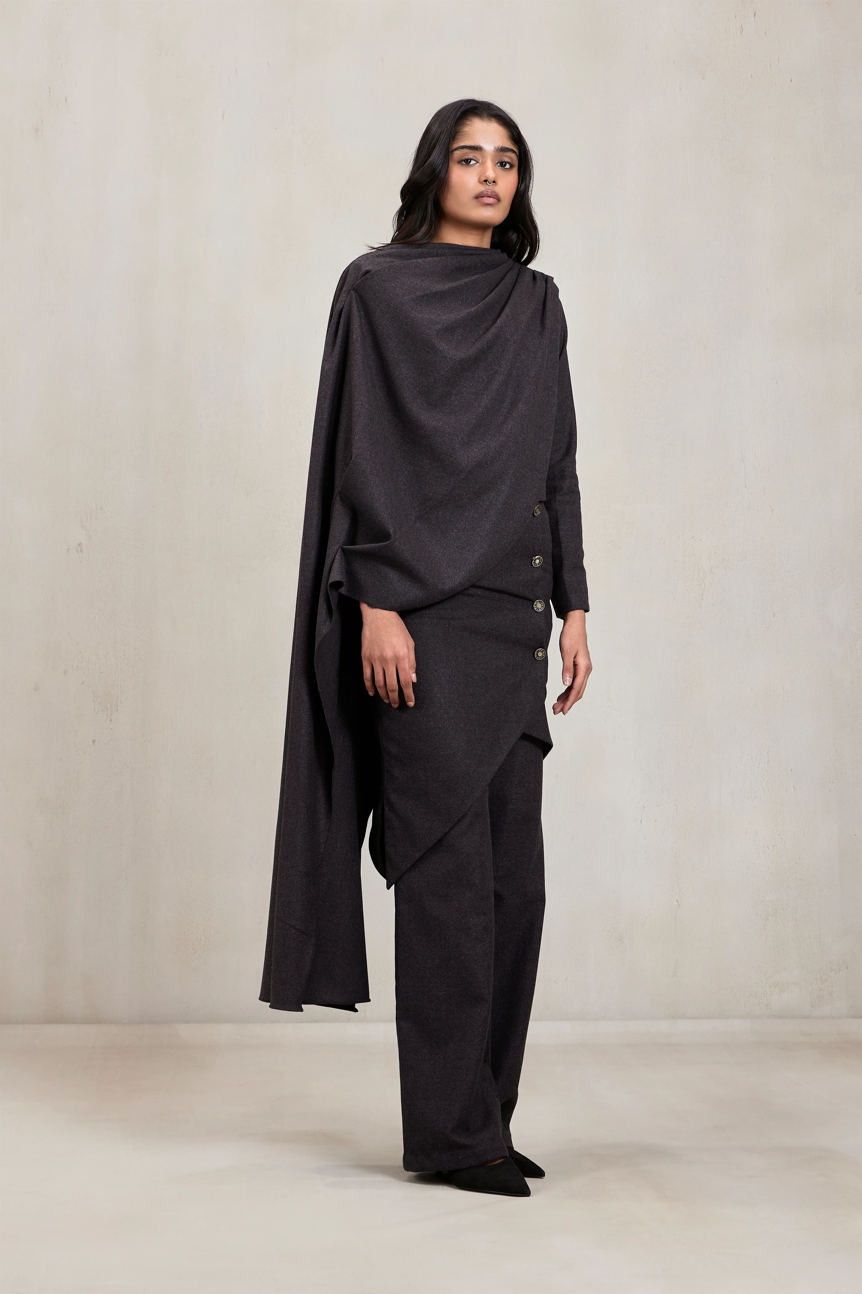 Tailoring meets drapery in this charcoal co-ord set, cut from a structured wool blend. The asymmetrical top features sculpted draping that extends from the neckline across the bodice, creating architectural folds. Paired with high-waisted trousers, the look is anchored by a draped overskirt panel fastened with a row of antique-finish buttons. This set exudes power dressing with an avant-garde twist