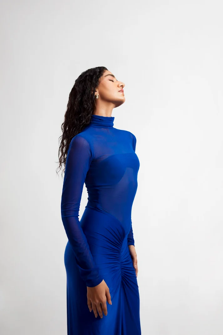 High neck dress with gathered lycra bottom with tube detail
