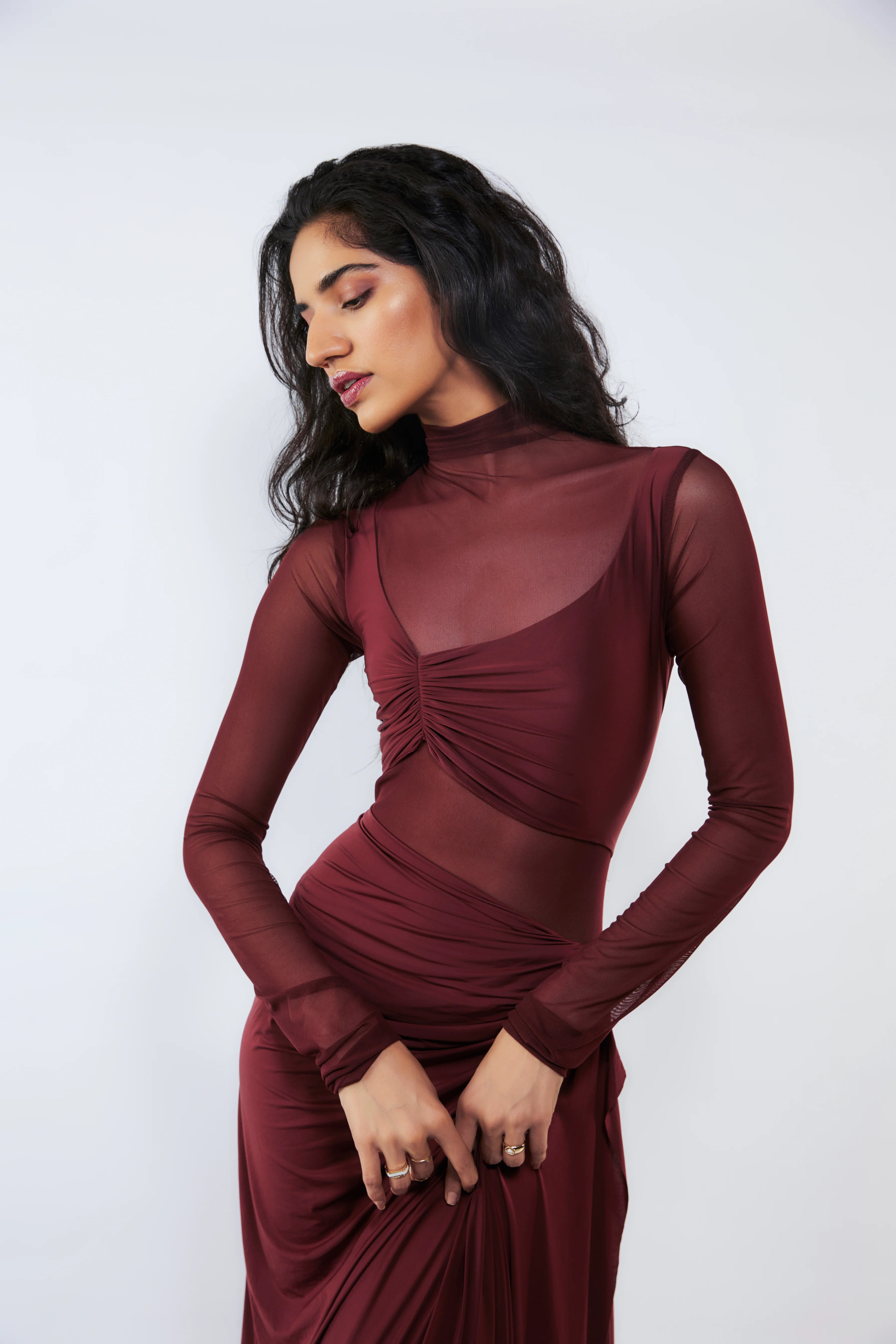 This dress features a high neck, full sleeves, and flattering pleating detail at