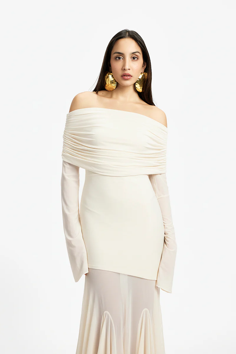 The dress features full sleeves and heavy ruching across the hips and waist, creating a flattering silhouette. The draped detail adds a touch of sophistication, while three gold brooches on the side of the ruched area provide a luxurious accent. Ideal for both formal and semi-formal occasions, this dress ensures you stand out with its unique and stylish design. The malai lycra tube gown, adorned with flared mesh panels for a touch of whimsical charm. The top coul bodice contours your figure with a flattering silhouette. Flowing from the waist down, the flared mesh panels add movement and dimension, creating an enchanting aura as you glide across the room. This gown exudes timeless elegance and feminine grace, ensuring you stand out with effortless poise and style.