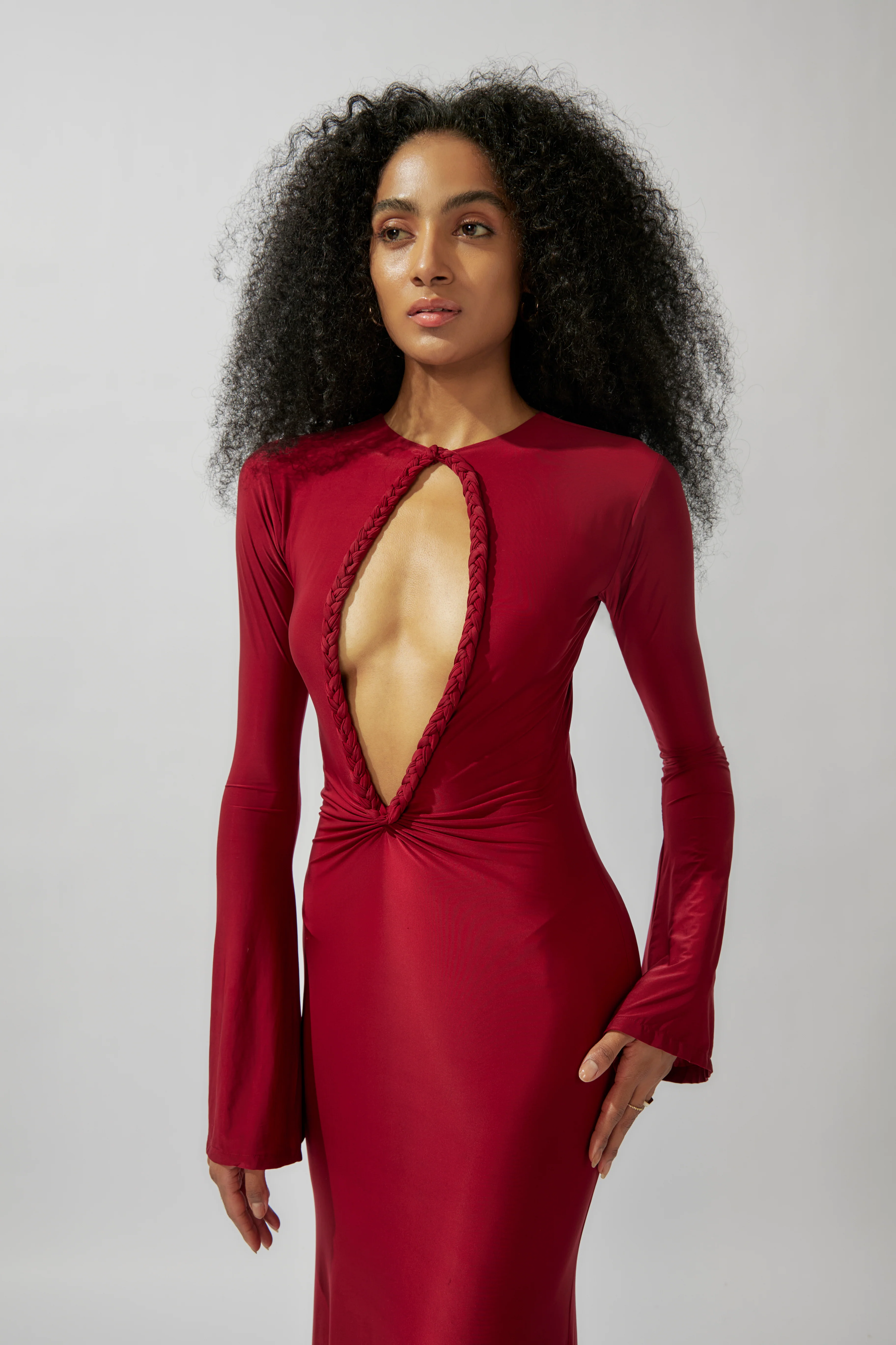 The flared long sleeves add a touch of drama and elegance to the silhouette, enhancing the overall allure of the gown. The front bust features a tasteful cut, adding a subtle hint of allure and intrigue to the ensemble. Meanwhile, the low deep back cut creates a mesmerizing focal point, exuding confidence and grace.