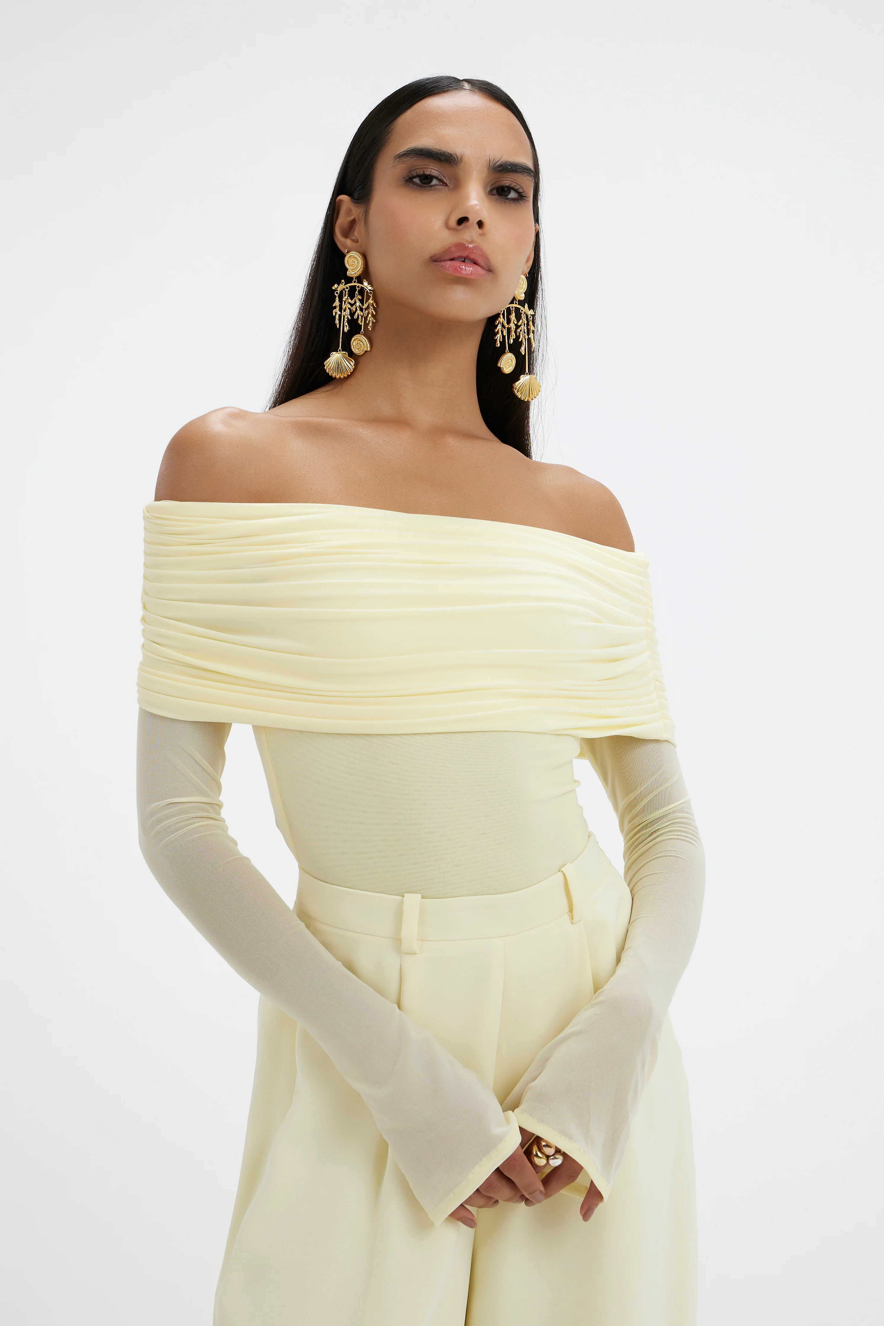 The design seamlessly blends a tube-coupled top with a modern aesthetic, striking the perfect balance between classic and contemporary. The see-through waist introduces an element of subtle allure, allowing a tasteful glimpse of skin while maintaining sophistication. . It's paired with flared, high-waisted trousers that offer a streamlined, tailored silhouette, enhancing the overall refined aesthetic.
