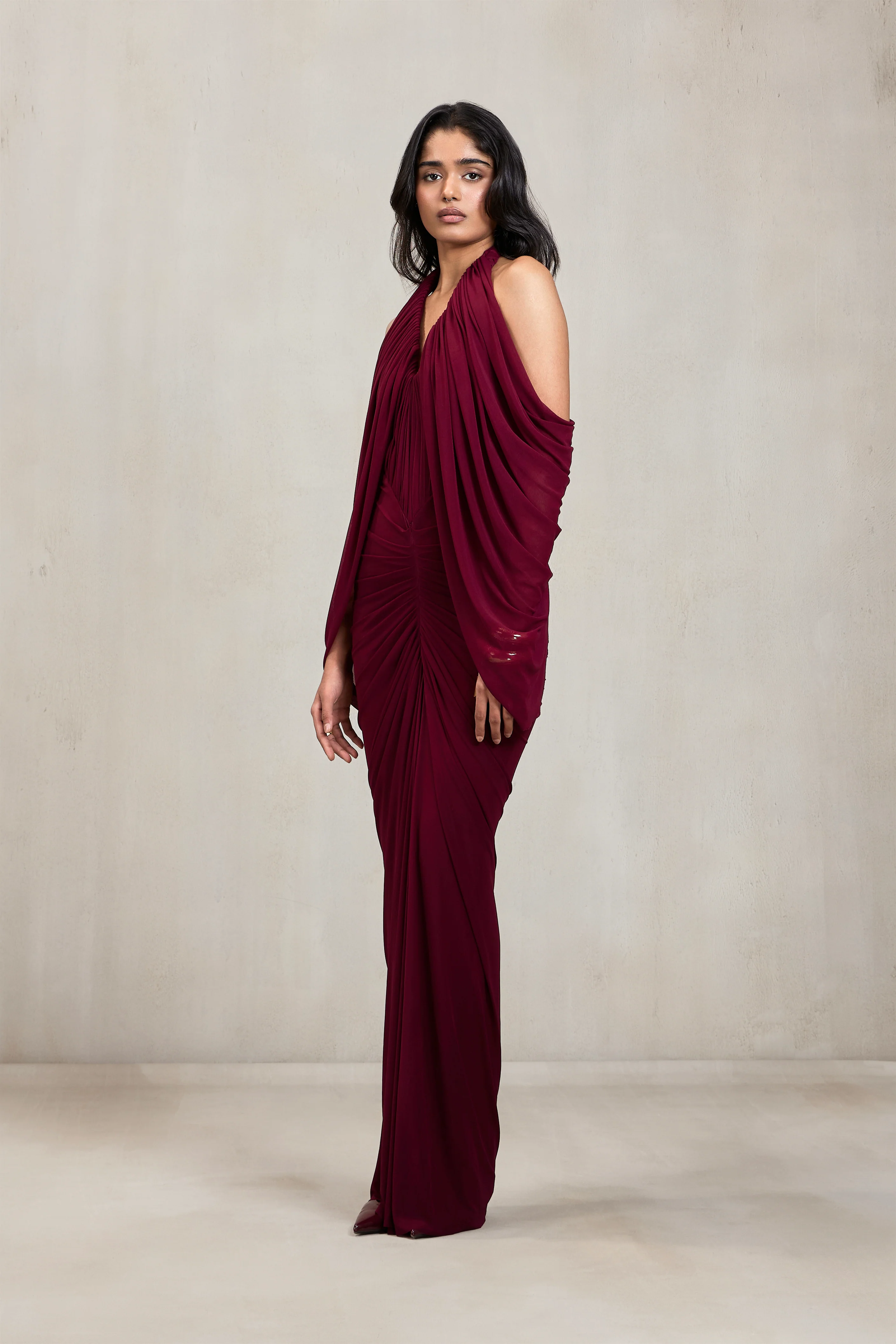 Turn heads with timeless grace in this Cold-Shoulder Draped Gown. Designed with a deep halter neckline and artful pleating throughout, this figure-skimming gown is elevated with cold-shoulder sleeves and a ruched bodice that flatters every curve. The sumptuous aubergine exudes opulence, while the fluid draping adds drama and allure. Perfect for formal events, galas, or red-carpet moments.