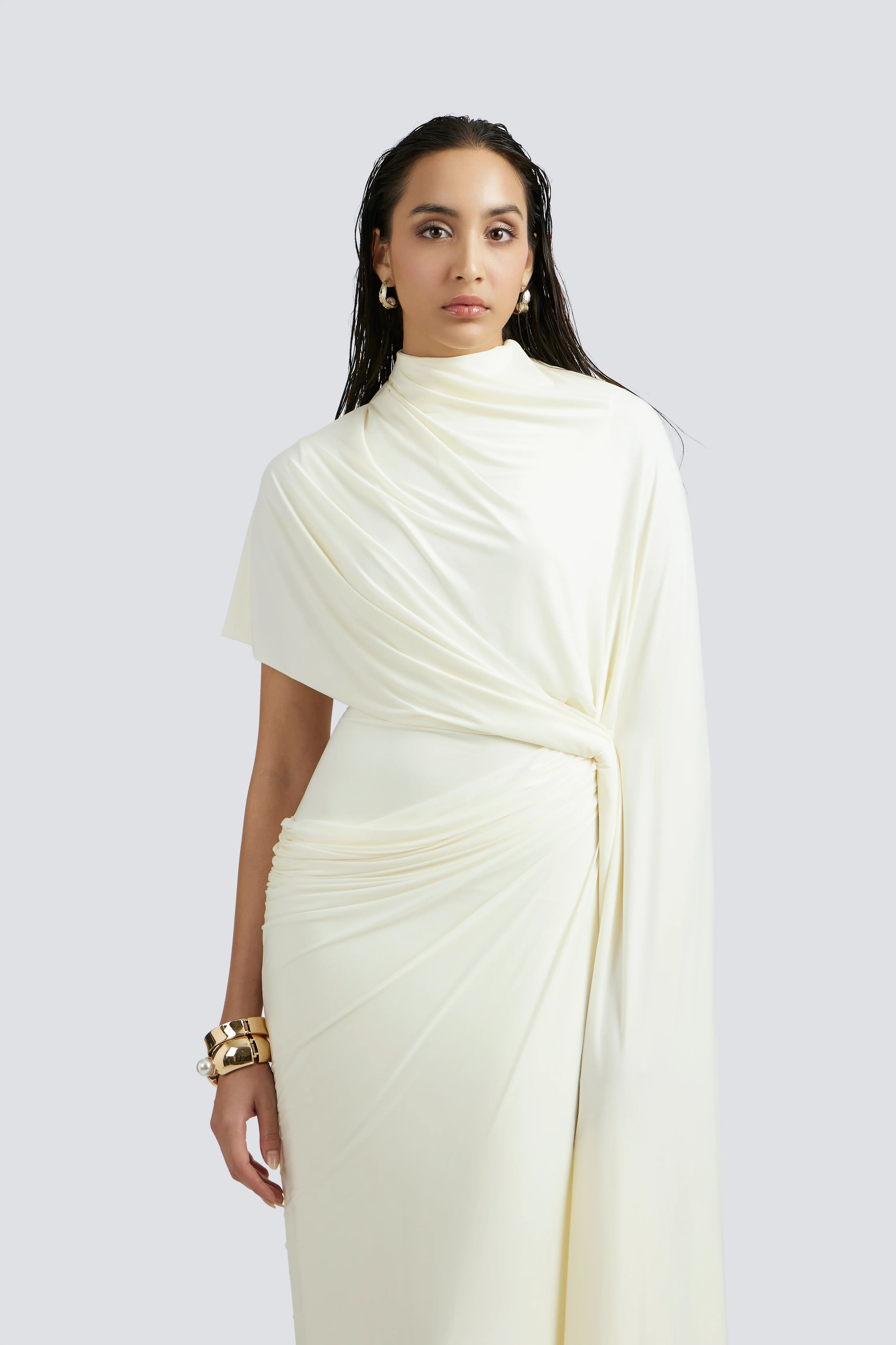 The malai lycra gown features a fitted body that highlights the natural silhouette, with a cowl detail at the low waist adding texture and interest. An asymmetrical cape-like drape extends from the design, creating a sense of flow and movement. The soft and stretchy fabric ensures a comfortable fit while maintaining a sleek appearance. The combination of the fitted body, low-waist cowl, and flowing cape detail offers a balanced and unique design.