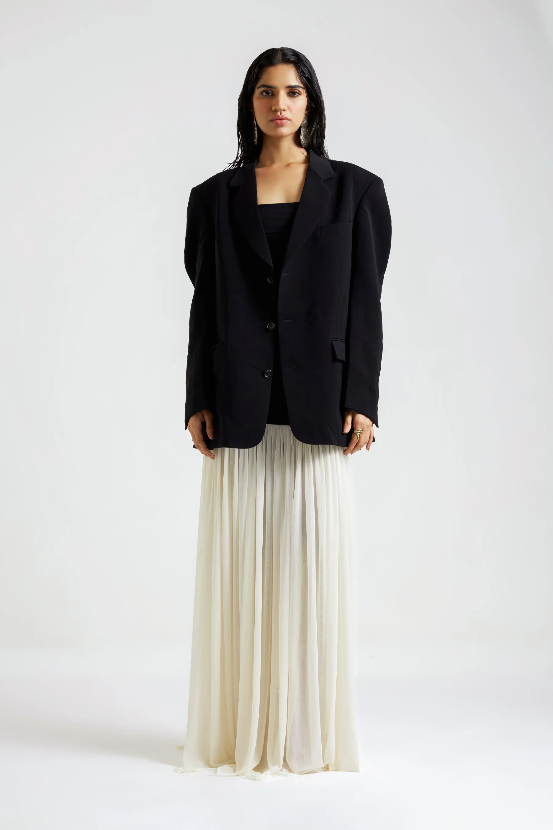 This gown features a sleek black bodice paired with an intricately gathered off-white net skirt that flows softly from the hips, creating a graceful silhouette. The combination of modern elegance and classic sophistication is elevated by the addition of a tailored black blazer, adding a refined and polished touch to the ensemble. Ideal for formal occasions with a contemporary twist.