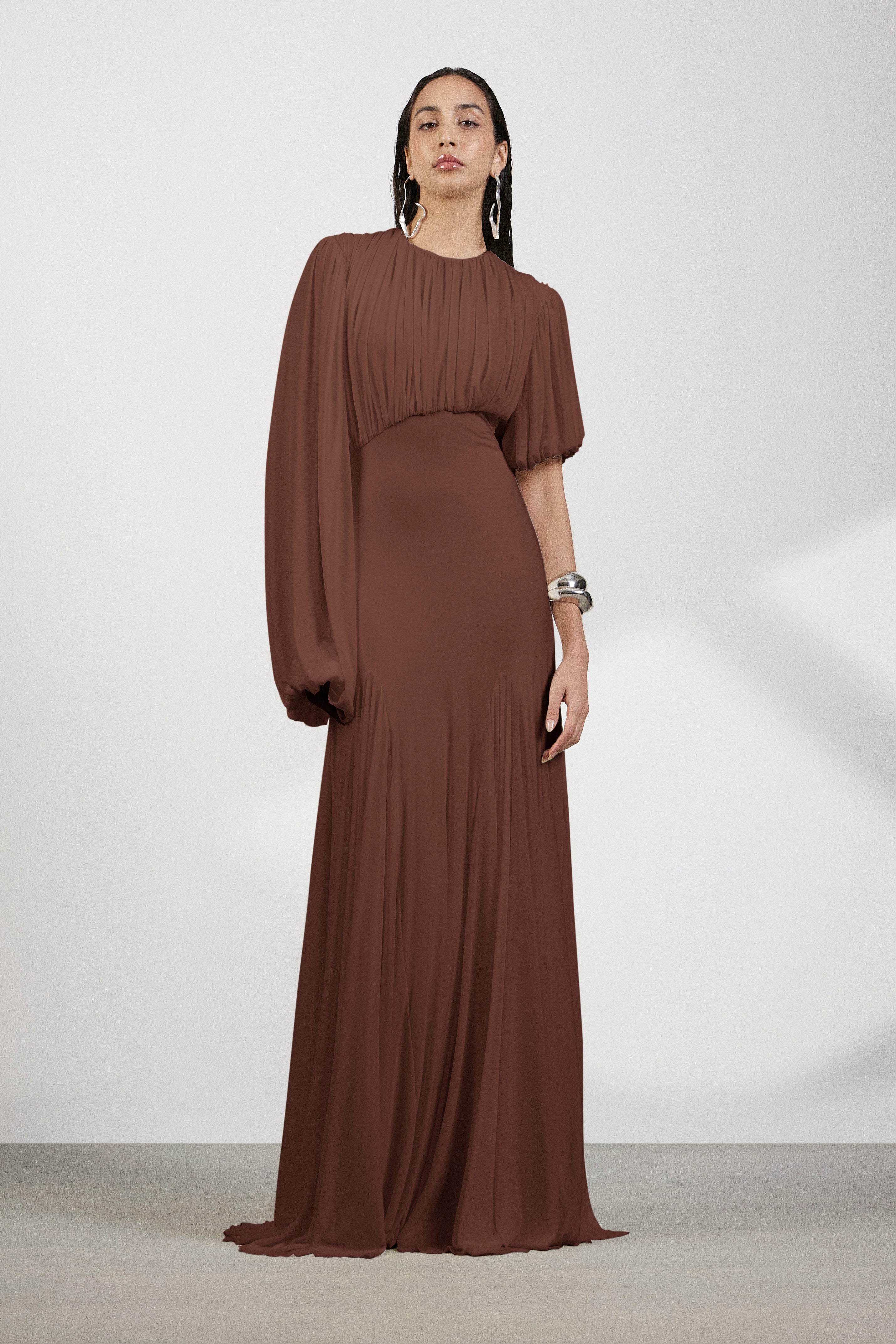 This dramatic gown features a bold, sculptural design with textured drape detailing on the bodice, creating an eye-catching focal point. The sleeves are designed in an asymmetrical balloon style—one long, the other shorter—adding an avant-garde twist. The bottom of the dress is enhanced with strategically placed panels on the thighs, adding volume and movement to the silhouette, while ensuring a dynamic flow as you move. This gown is an exquisite blend of modern structure and fluid elegance, perfect for making a statement at any special occasion.