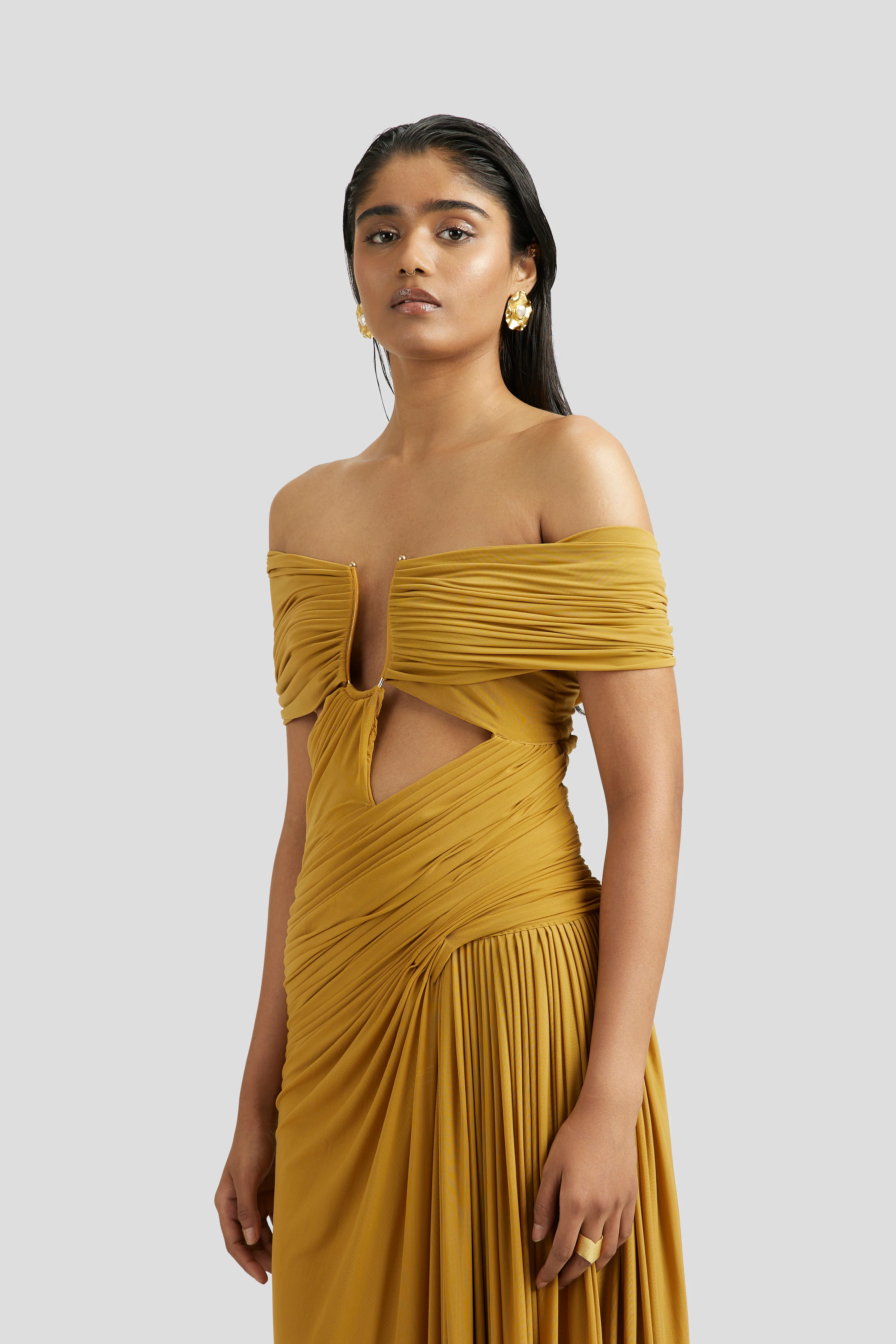 This gown with its elegant U clip detail at the neckline and draping is designed to make a memorable impression, combining modern style with timeless elegance. Whether worn to a formal event or an evening party, this gown ensures that the wearer will stand out with grace and sophistication.