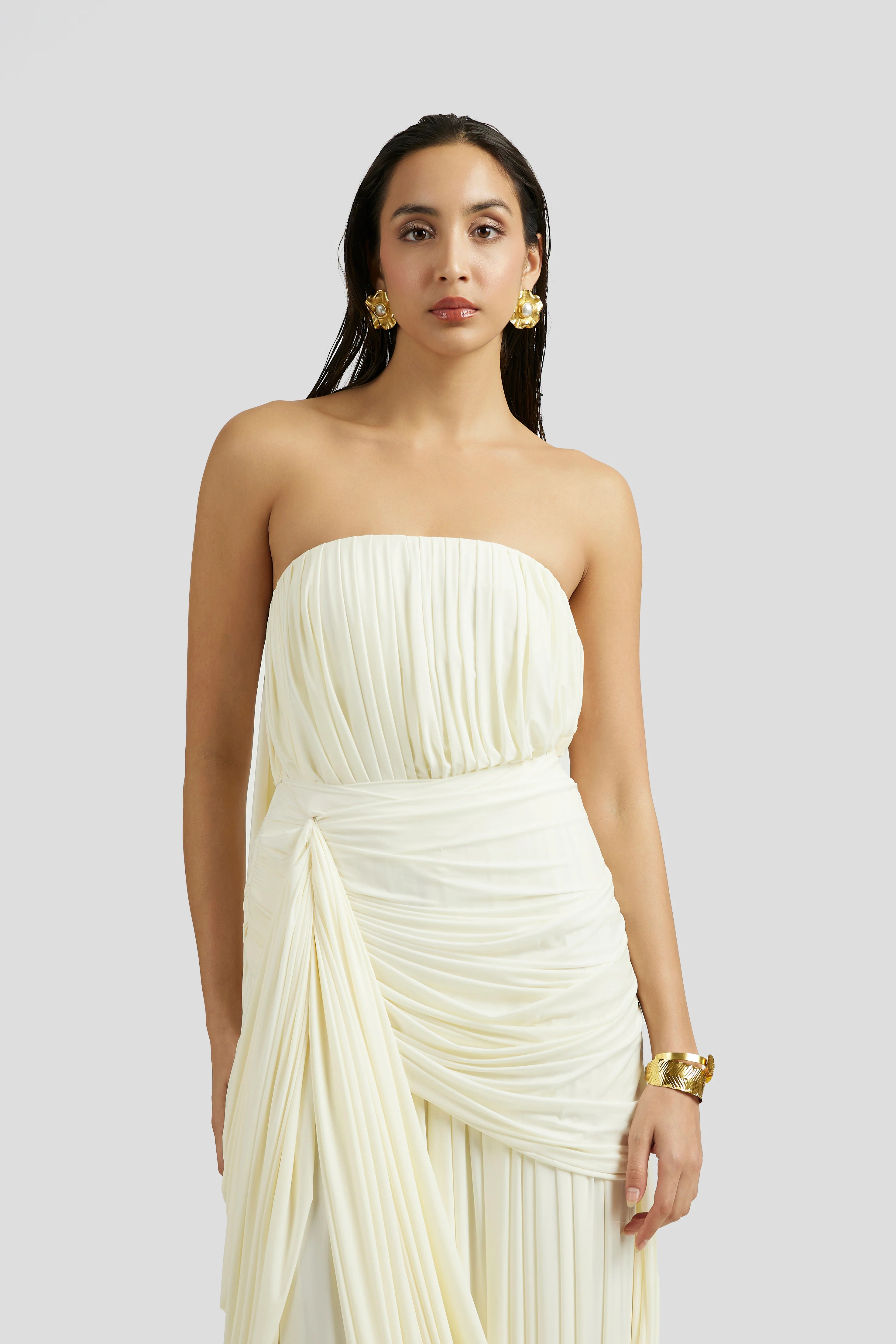 This elegant gown features a rushed tube neckline and draped waist and a beautifully pleated skirt that adds movement and grace. Drapes cascade elegantly, falling in an enchanting manner. The gown’s design combines sophistication with a touch of whimsy, creating a look that is both refined and captivating.