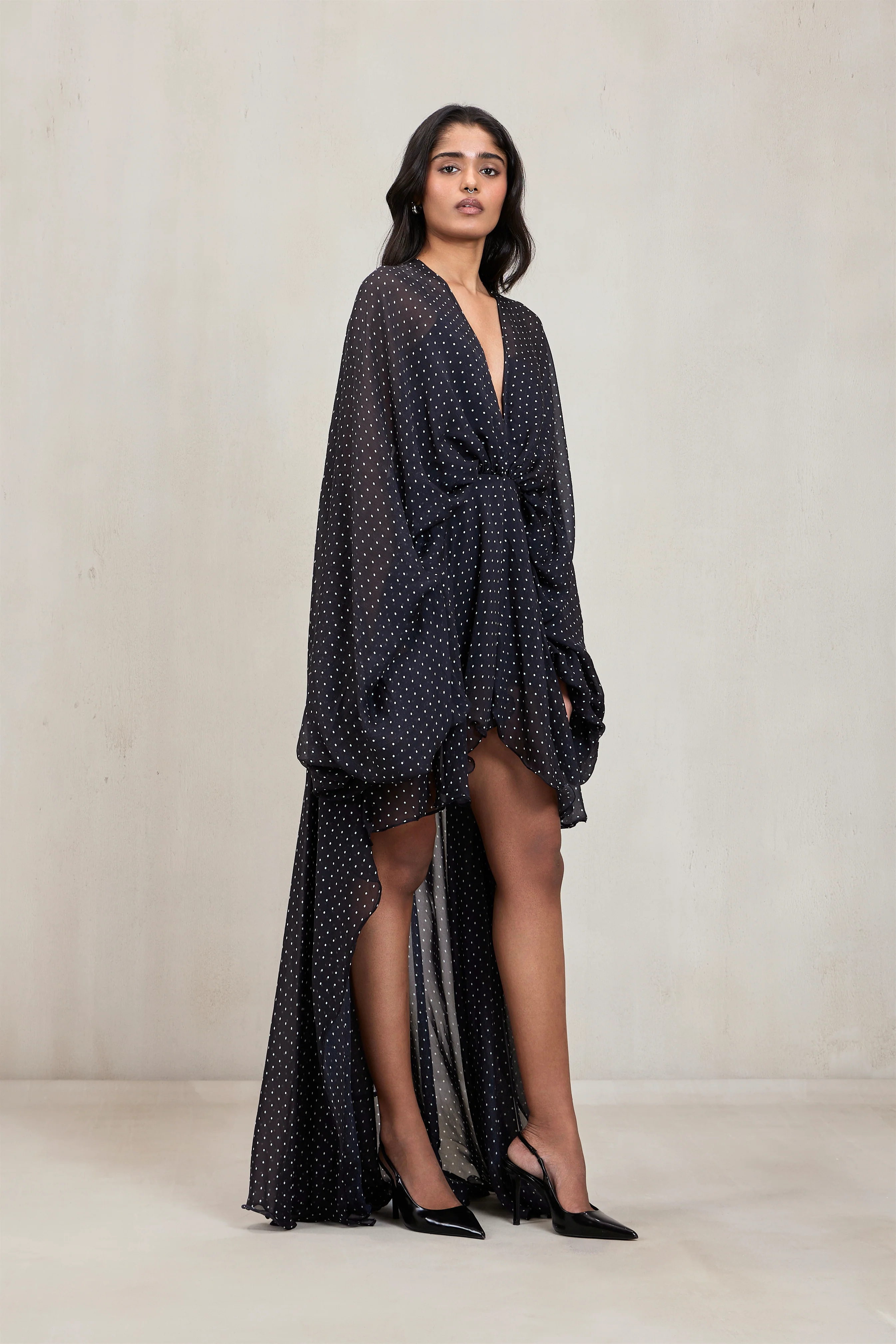 Playful yet poised, the Midnight Polka Dot High-Low Dress blends classic charm with a daring silhouette. Featuring a deep V neckline and cascading bell sleeves, the high-low hem adds movement and drama. Made from sheer, lightweight fabric with delicate white polka dots, this dress is both breezy and bold — ideal for resort evenings or rooftop soirees. Style with pointed pumps and statement earrings.