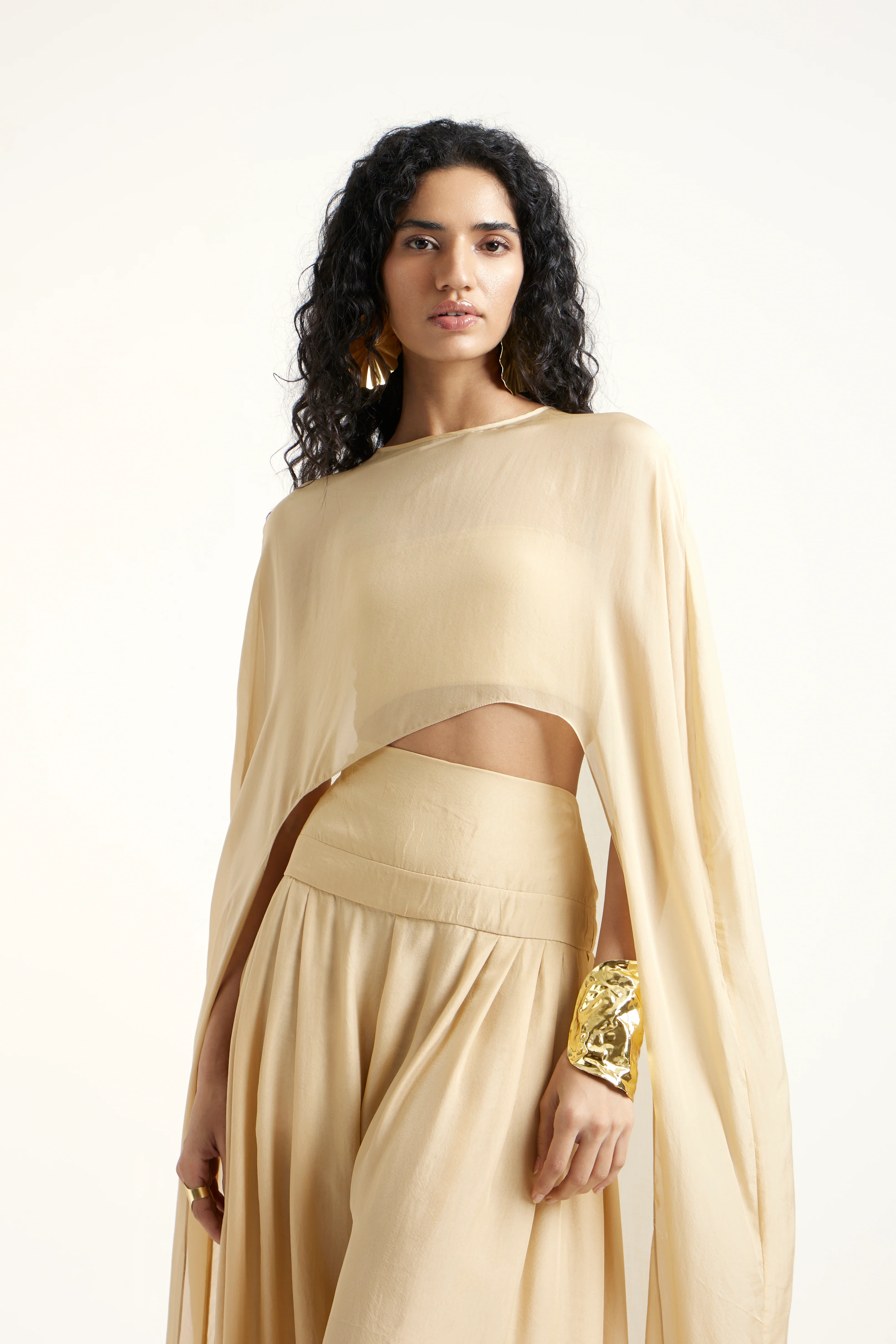 A luminous gold coord set crafted in malai and pure chiffon, offering a sophisticated combination of structure and transparency. The bandeau and cape deliver a graceful, layered effect, while the pants create a fluid, elongated line. The Robin set is both modern and ethereal — an effortless statement for polished events and refined celebrations.
