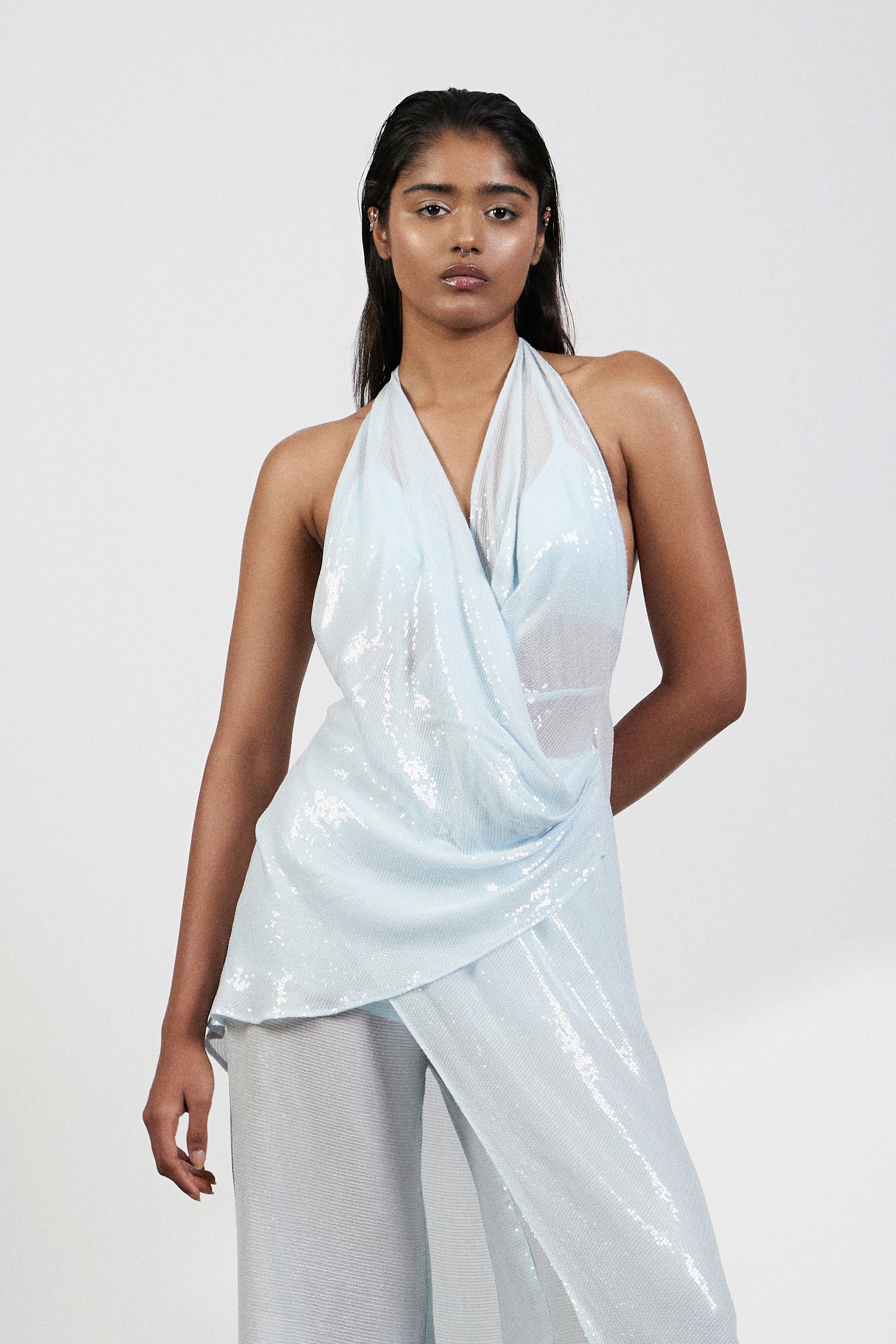 A dreamy statement in baby blue, this sequinned draped top features a fluid asymmetrical hem and a dramatic long flowy panel that adds movement and allure. Backless and artfully constructed, it pairs effortlessly with matching sequin flared pants and a coordinating Malai bikini. Shimmering and sculptural, this look is designed to turn heads—whether you're dancing under the stars or owning the room.