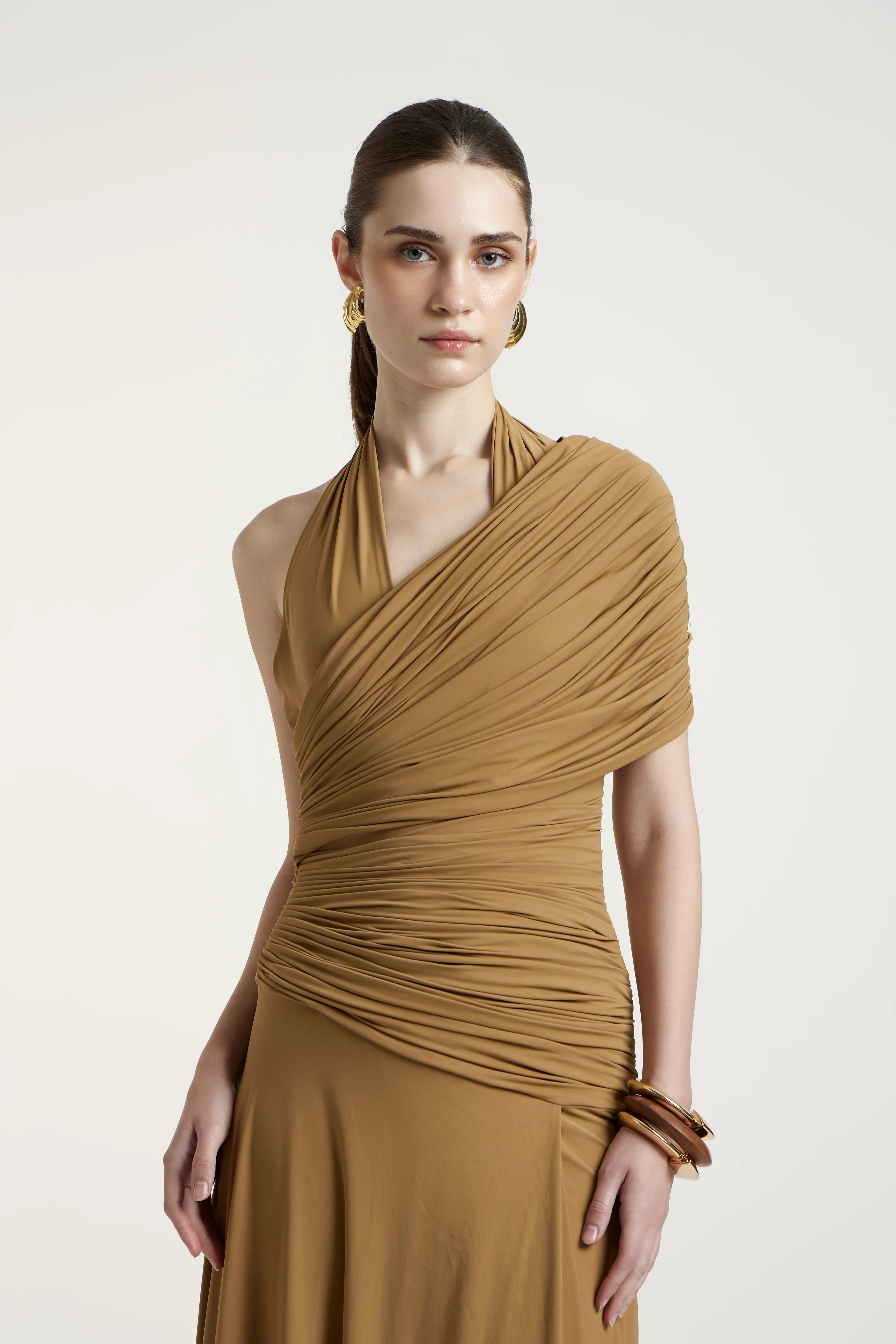A dark beige dress crafted in net and malai, blending earthy tones with an airy, modern silhouette. The sheer net layers add softness and movement while the malai underlayer ensures comfort and structure. Elegant, minimal, and versatile — an elevated neutral for refined occasions.