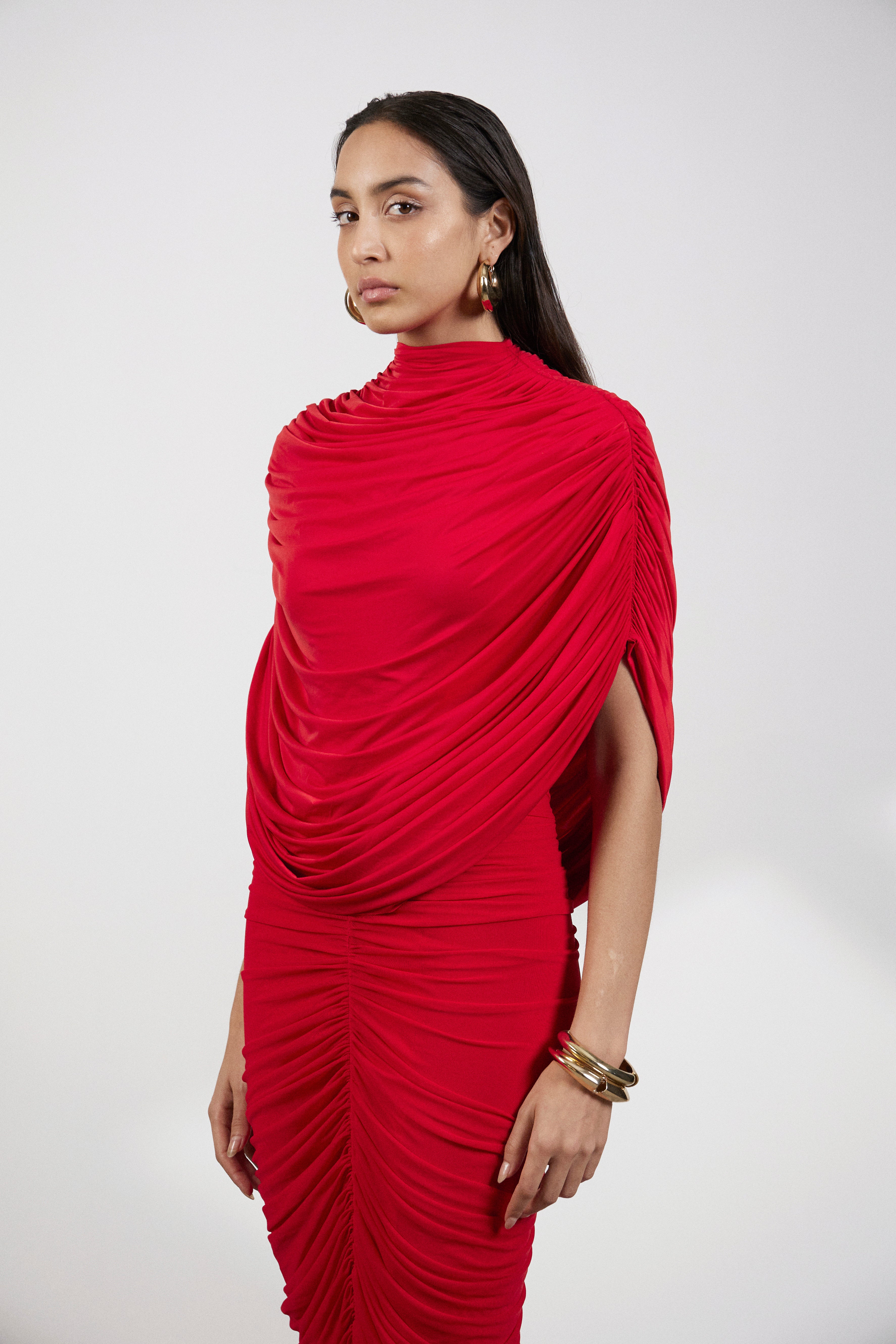 Make an unforgettable entrance in this striking red bodycon gown, crafted from soft malai lycra and net for a sleek and sculpted fit. The design features a fully pleated and draped shoulder cape that adds dramatic texture and elegance to the upper silhouette. The bottom of the gown continues the ruched detailing, enhancing every curve with its figure-hugging form. Combining bold structure with the intricate detailing, this gown is a true statement of confidence and sophistication for any special occasion.