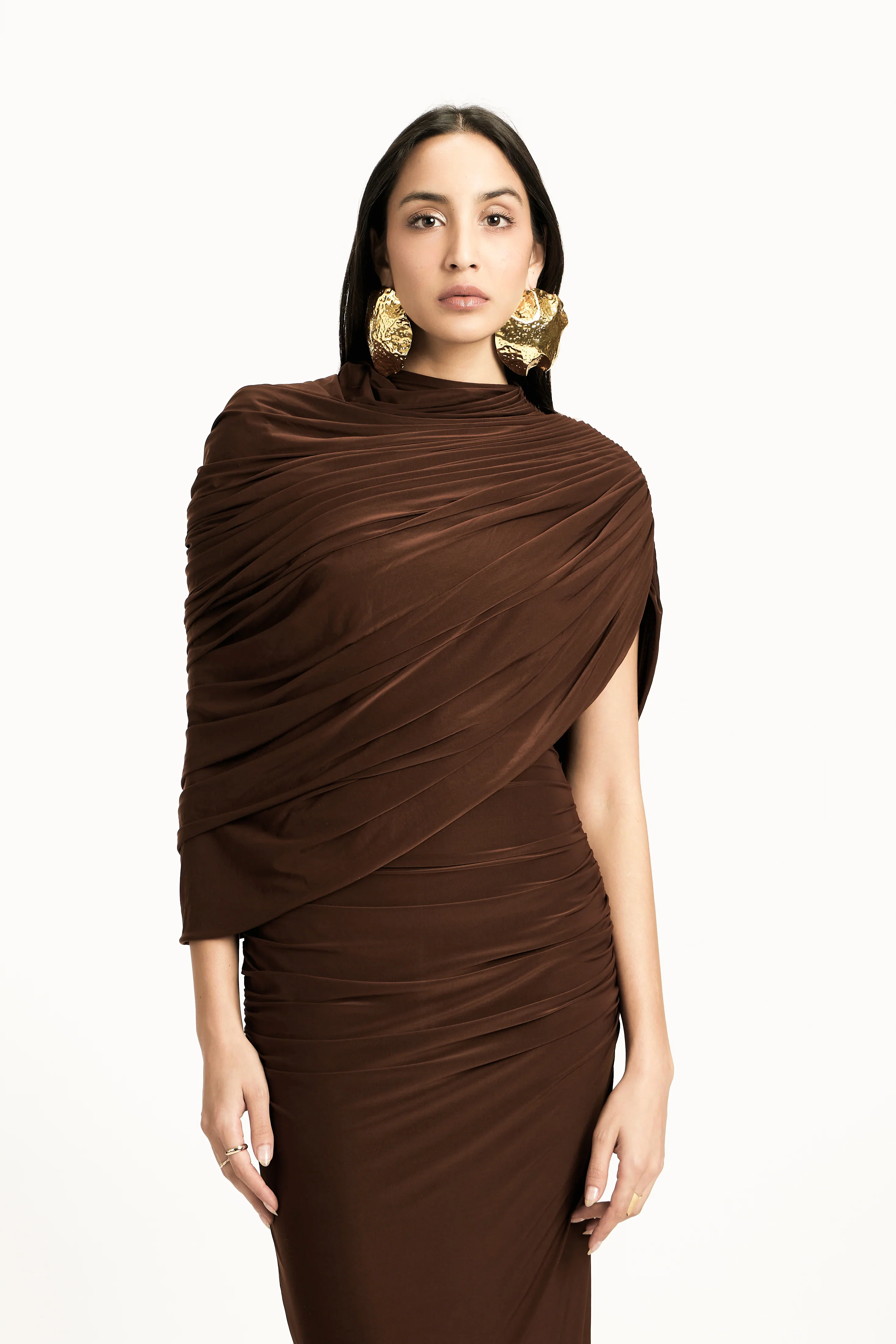 The gown is crafted from soft malai lycra fabric, offering a fluid and comfortable fit. The design features a fully draped, cape-like top that adds volume and a distinctive silhouette to the upper half. The body of the gown is detailed with draping and ruching, enhancing the fit and adding texture to the design. The combination of the cape-like top and the ruched gown creates a harmonious blend of structure and softness, making it a statement piece for various occasions.